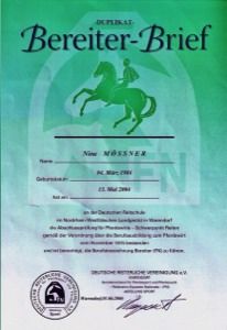 2004 (Mai) erfolgreicher Abschluss der Bereiter Prüfung im Haupt und Landgestüt Warendorf